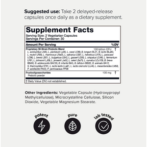 Cepas probadas por terceros: factores como el lugar de origen, las condiciones de almacenamiento y las condiciones de tránsito pueden conducir a una disminución de la potencia e incluso el riesgo de contaminación bacteriana para cualquier probiótico (incluidos probióticos específicos para mujeres y probióticos para hombres). Es por eso que nuestras 30 cepas están completamente probadas y verificadas para cada lote.