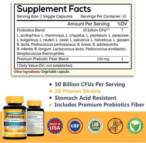 Fórmula de liberación dirigida de 50 mil millones de 20 cepas Las cápsulas de probióticos NewRhythm 50 mil millones están respaldadas científicamente y clínicamente probadas. Formuladas por médicos con 50 mil millones de organismos vivos por porción, cuentan con tecnología de liberación dirigida para ayudar a los probióticos a sobrevivir a los ácidos estomacales y llegar a su tracto intestinal. La fibra prebiótica orgánica también está incluida en la fórmula.