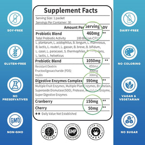 EL MEJOR SUPLEMENTO DIGESTIVO PARA USTED: Nuestro polvo de probióticos también contiene 7 tipos de enzimas y prebióticos. Los prebióticos pueden mantener vivos a los probióticos para que estén activos, y diferentes enzimas pueden ayudarnos a superar una variedad de problemas digestivos, mejorar nuestra absorción de nutrientes y maximizar los efectos para nuestro cuerpo. También ayuda a reconstruir el sistema digestivo y a crear un ambiente intestinal saludable.