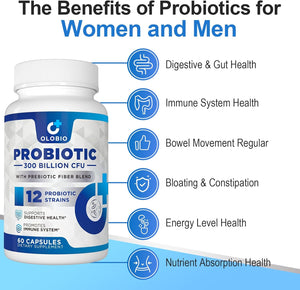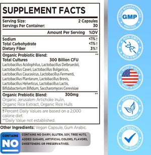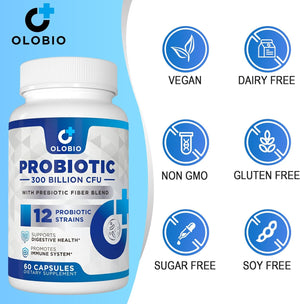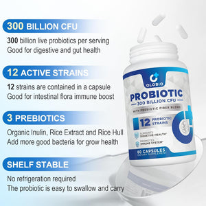 El suplemento probiótico OLOBIO de 300 mil millones de UFC de fuerza máxima contiene 60 cápsulas durante 30 días de suministro, toma 2 cápsulas probióticas por día. Nuestra cápsula probiótica contiene 3 prebióticos orgánicos y 12 probióticos, buenos para la hinchazón y el estreñimiento, inmune, digestiva e intestinal.