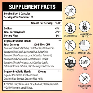 Un suplemento probiótico completo para la máxima salud digestiva e intestinal., Happy Gut Flora, Happy Life – Nuestro probiótico de 300 mil millones de CFU está hecho para mujeres y hombres. Nuestro probiótico más prebiótico orgánico ayuda naturalmente a equilibrar tu intestino, eliminando la hinchazón y apoyar el sistema digestivo. Ideal para la salud digestiva e intestinal, hinchazón, salud intestinal y apoyo a la salud inmune., Promueve una digestión saludable: nuestros probióticos están hechos con 12 probióticos y 2 prebióticos basados en investigación clínica. 12 probióticos trabajan con la flora intestinal natural de tu cuerpo, ayuda a eliminar la mala flora intestinal para apoyar un tracto digestivo saludable y un sistema inmunológico. Los prebióticos ayudan a descomponer la comida que comes y nutren tu buena flora intestinal para que pueda prosperar y trabajar de manera más eficiente en tu cuerpo.
