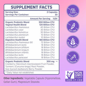 Probióticos especializados para mujeres: nuestro probiótico vaginal diario para mujeres, que contiene 300 mil millones de UFC de probióticos de 12 cepas clínicamente probadas. Estos probióticos vaginales para mujeres son buenos para el equilibrio del pH, la inmunidad y la salud digestiva, vaginal y del tracto urinario.