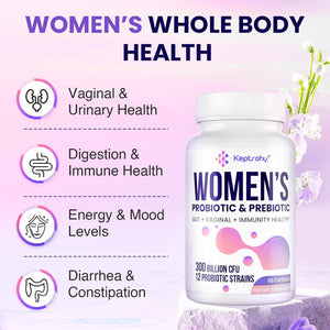 Probióticos vaginales con 300 mil millones de UFC: una combinación cuidadosamente seleccionada de probióticos y prebióticos que trabajan juntos para brindar beneficios a la salud del sistema digestivo, inmunológico, vaginal y del tracto urinario. Keptrohy Women's Probiotic tiene 60 cápsulas, 2 cápsulas al día durante 30 días. Un frasco de probiótico Viginal para la salud de todo el cuerpo