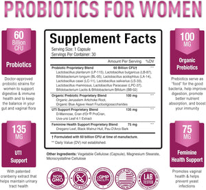 - Protección allí abajo: la vaginosis bacteriana, la infección por hongos y otros problemas que afectan su salud femenina pueden hacer que se sienta incómoda e incluso poco atractiva, ¡lo que no se merece! Nuestros probióticos para mujer contienen cepas probióticas activas y una mezcla de apoyo femenino para mantener tu flora vaginal y el equilibrio de levadura. Nuestro suplemento también contiene una mezcla de apoyo para la infección urinaria para ayudar a minimizar las bacterias en la orina. Tu salud femenina es importante para que te mereces toda la protección adecuada que puedas obtener