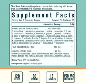 Probióticos + Prebióticos + Enzimas Digestivas: Nuestro probiótico está formulado con 120 mil millones de cultivos vivos y 30 cepas ampliamente investigadas de Lactobacillus, Bifidobacterium, Lactococcus, Streptococcus y Pediococcus, dirigidas a diferentes áreas de bienestar. * Sin embargo, no nos detuvimos en esta fórmula de alta potencia, hemos combinado nuestro probiótico una vez al día con prebióticos para alimentar los cultivos amigables, y 13 enzimas digestivas cuidadosamente seleccionadas que facilitan aún más la digestión y la salud intestinal. *