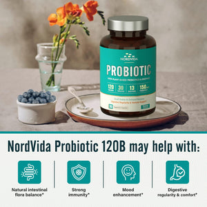 Entrega dirigida, no requiere refrigeración: el probiótico Nordvida 120B está protegido por tecnologías de liberación dirigida, que ayudan a los probióticos a sobrevivir al ácido estomacal y la bilis agresivos para llegar a tu intestino delgado donde pueden ejercer la máxima eficacia. Se recomienda refrigeración, pero no es necesario. Puedes disfrutar de todos los beneficios de los probióticos mientras estás en movimiento.