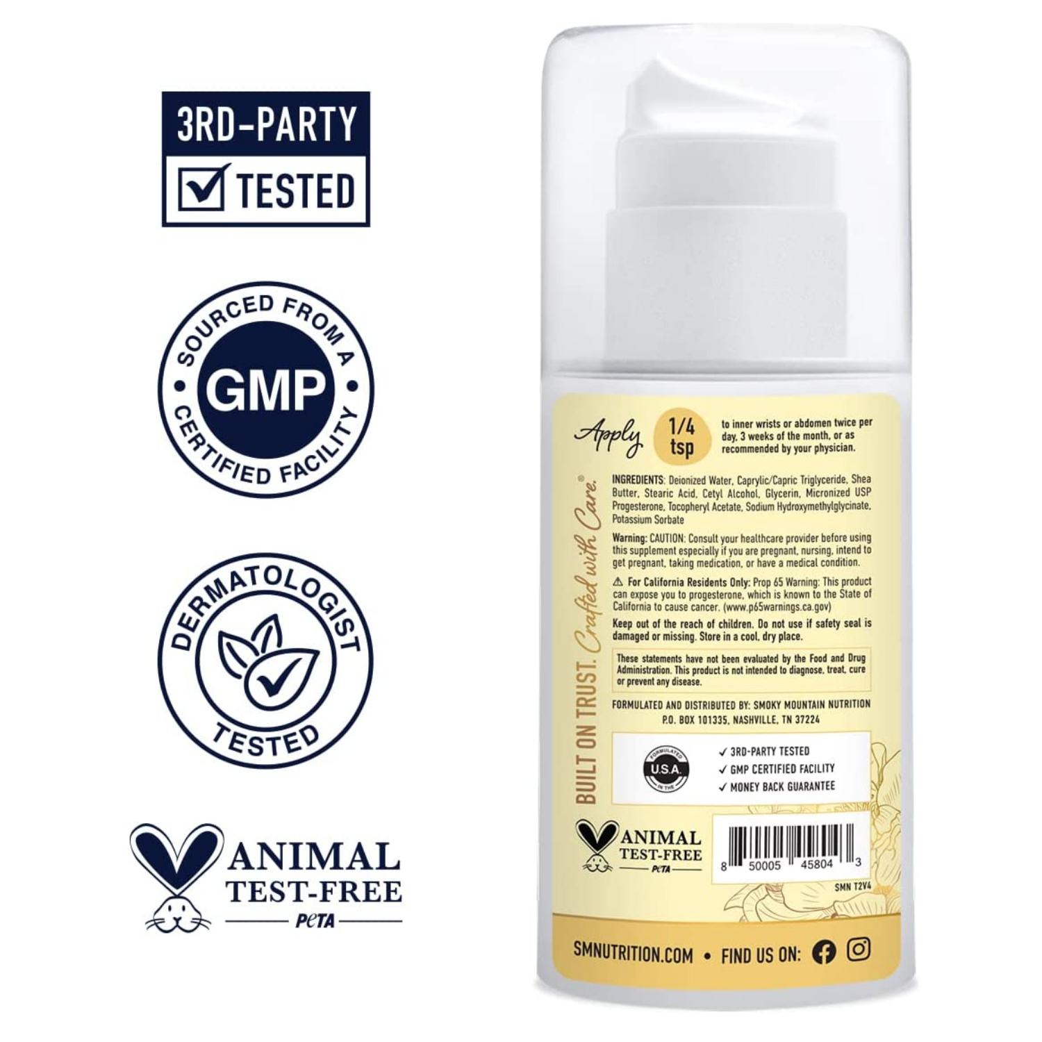 Cada 4 oz. bomba contiene 2000 mg de progesterona USP micronizada. Cada porción contiene ~21 mg. Con porciones dos veces al día e ingredientes de alta calidad, nuestra crema está formulada intencionalmente para un equilibrio óptimo en la mediana edad. Como todos los productos de SMNutrition, Advanced Formula Progesto-Life se somete a pruebas exhaustivas. Cada lote es probado por terceros y fabricado en instalaciones registradas por la FDA que cumplen con las pautas de GMP.