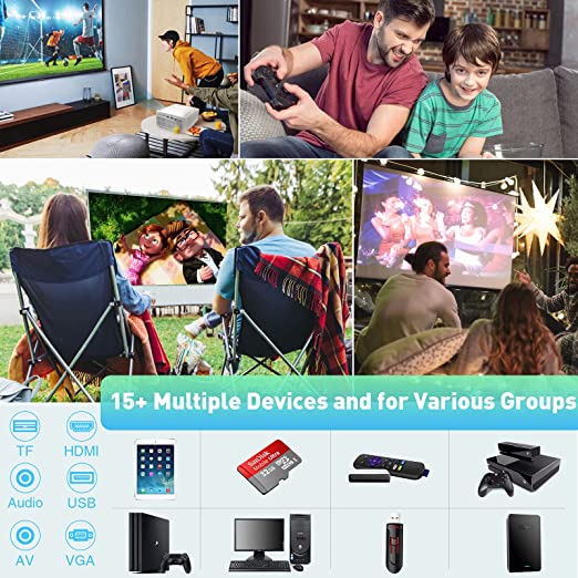 Equipado con interfaces HDMI, VGA, AV, USB, el proyector es compatible con TV Box, TV Stick, PC, computadoras portátiles, tabletas, unidades flash USB y reproductores. Se supone que se aplica a muchos entornos: cine en casa, videojuegos, fiestas. Puede usarlo para pequeñas reuniones en una habitación oscura, pero no es un proyector de oficina profesional para PPT o texto. En cuanto a los derechos de autor, algunos videos (como Netflix) no se pueden reproducir a través de una conexión telefónica (wifi o usb).