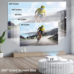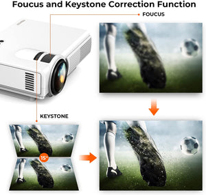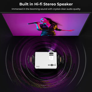Altavoz estéreo de alta fidelidad con pantalla gigante. El proyector de video Nativo TENKER Q5 de 1080p lanzará una pantalla de 36 a 200 pulgadas con distancia de proyección de 4.4 pies a 12.5 pies. Con los altavoces estéreo de alta fidelidad integrados, este pequeño proyector puede ofrecer un sonido en auge con una calidad de audio cristalina y proporcionar una experiencia de escucha maravillosa para ti. Además, puedes añadir tu propio altavoz externo para un mejor sonido a través de 3. Entrada de audio de 0.197 in.