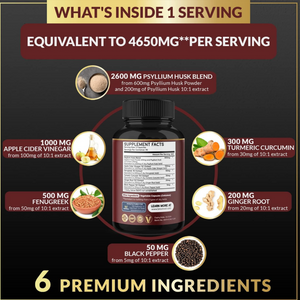 6 en 1: cáscara de psyllium, vinagre de sidra de manzana, fenogreco, curcumina de cúrcuma, jengibre y pimienta negra.