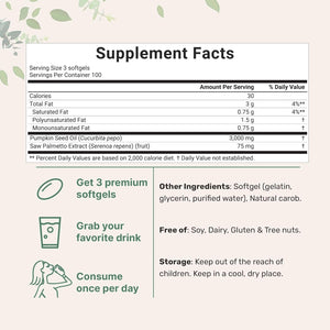 Cada bolsa ofrece 300 cápsulas blandas con un tamaño de porción de 3 cápsulas blandas, contiene 3,000 mg de aceite de semilla de calabaza con 300 mg de extracto de aceite de palma enana americana 4:1 por dosis, hasta un suministro de 100 días.