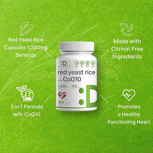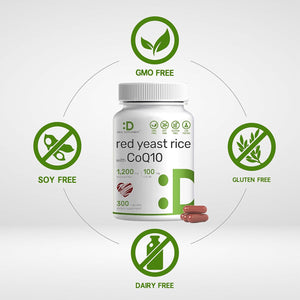 Dosis y porciones: 300 cápsulas por botella, tamaño de porción de 3 cápsulas, entrega 1,200 mg de polvo de arroz de levadura roja con 100 mg de CoQ10 como ubidecarenona por dosis, dura más de un suministro de 3 meses (100 porciones).