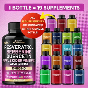 Mezcla de polifenoles: descubra el poder del resveratrol y los polifenoles con nuestras cápsulas de mezcla de resveratrol, elaboradas meticulosamente con 19 ingredientes potentes que incluyen resveratrol, quercetina, vinagre de sidra de manzana (ACV), acai, noni y berberina, potentes antioxidantes, nutrientes, vitaminas y minerales.