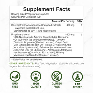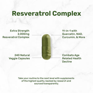 El resveratrol complejo de DEAL 2000 mg es un potente antioxidante que combate el envejecimiento celular, mejora la salud cardiovascular y apoya la longevidad. Con 240 cápsulas vegetales sin OGM, es ideal para quienes buscan un suplemento integral para la salud general y la vitalidad celular.