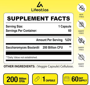 SACCHAROMYCES BOULARDI PROBIOTICOS LIFEATLAS 200 BILLONES CFU 60 CAPSULAS VEGETALES VEGANO SIN GMO LIFEATLAS