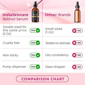 Salud de la piel: fórmula avanzada de suero antiarrugas mejora eficazmente la salud de la piel. El retinol renovador de la piel evita la contaminación, minimiza las manchas oscuras y mejora la textura de la piel. El brillo saludable de tu piel es fácil con retinol para la cara por InstaSkincare. Fórmula antienvejecimiento: el retinol sérico es conocido como uno de los mejores sueros para el envejecimiento de la piel. El suero facial con retinol minimiza visiblemente las arrugas y las líneas finas. El suero antienvejecimiento ralentiza el proceso de envejecimiento al acelerar la renovación de las células de la piel y la producción de colágeno Detén el acné: el suero de retinol de ácido hialurónico reduce los brotes de acné mientras cura las cicatrices posteriores al acné. El retinol es un tensor de poros eficaz, reduciendo puntos negros y puntos blancos. El suero de retinol controla la grasa de la piel y ayuda a la piel a deshacerse de las células muertas. Fórmula natural: nuestro suero antioxidante está hecho de ingredientes de la más alta calidad, de concentraciones seguras: retinol; extractos de manzanilla, hoja de olivo y té verde; aceite cítrico y jugo de hoja de aloe. El suero de retinol se puede utilizar incluso para las pieles más sensibles. Extremadamente importante: utiliza suero antiarrugas para la cara solo por la noche sobre la piel limpia y seca. Dispensar una cantidad del tamaño de un guisante del suero de retinol orgánico. Aplique protector solar con un SPF de 30+ después de usar Retinol Night Serum mientras evita la exposición al sol durante las horas pico.