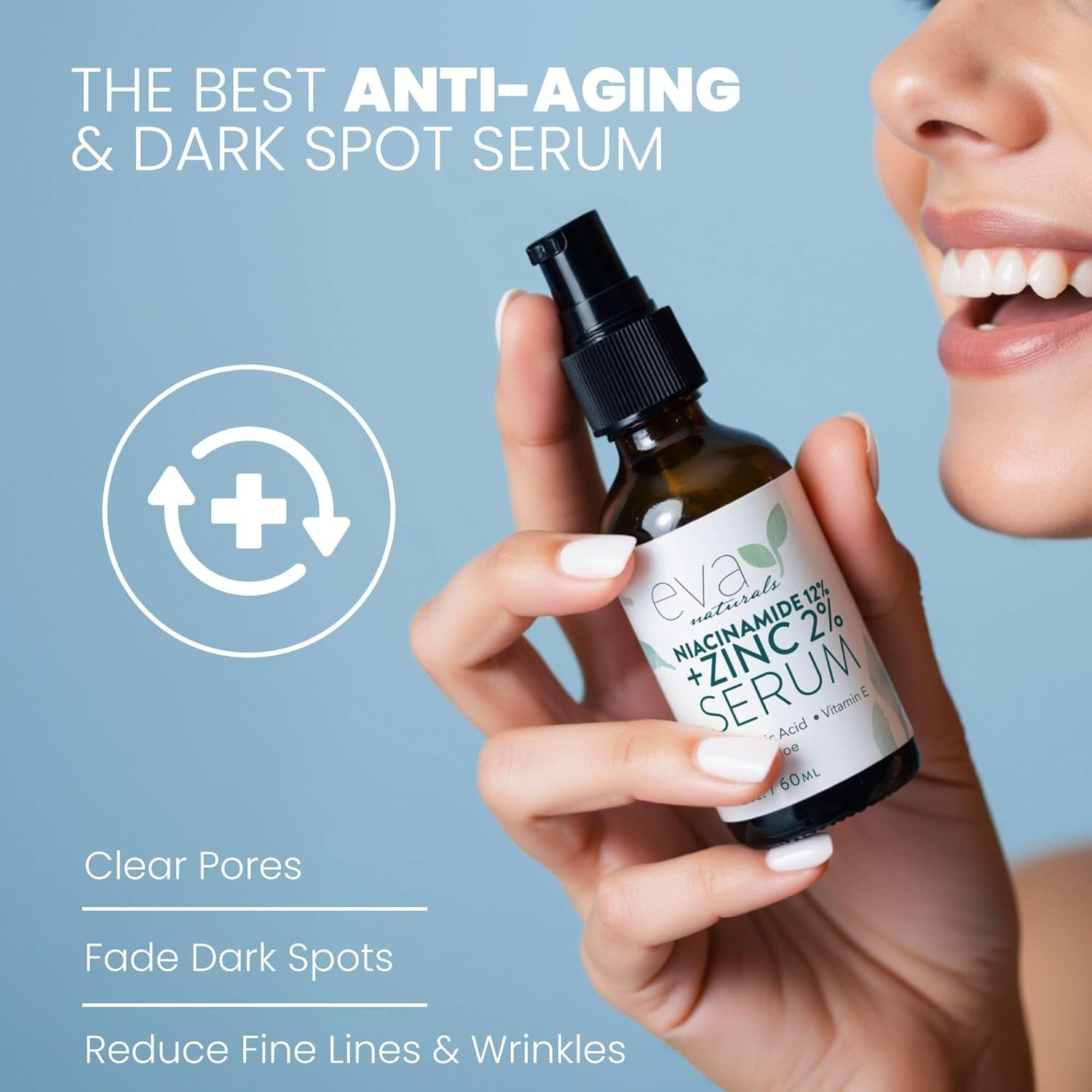 Descubra el secreto para una piel perfecta con el sérum Niacinamide 12% + Zinc 2% de Eva Naturals. Esta potente combinación equilibra la producción de grasa, minimiza los poros, mejora el tono de la piel e hidrata con una infusión nutritiva de ácido hialurónico y aloe orgánico. Experimente una piel rejuvenecida y sin imperfecciones con solo unas gotas de esta fórmula ligera y de rápida absorción.