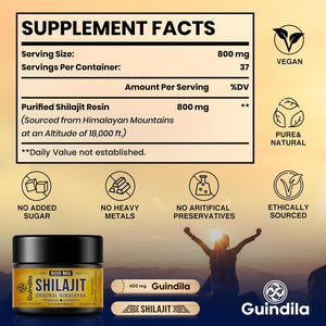 Disfrute del poder del Shilajit orgánico del Himalaya: la resina de shilajit del Himalaya original de grado dorado de Guindila le brinda los tesoros de la naturaleza con la máxima potencia de 800 mg por porción. Con su rica combinación de más de 85 minerales traza y ácido fúlvico y húmico, se sentirá rejuvenecido*, con energía* y listo para afrontar el día.