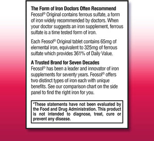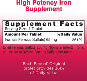 Suplementos de hierro de alta potencia para mujeres, hombres y niños mayores de 12 años: cada tableta Feosol Original contiene 65 mg de hierro elemental, equivalente a 325 mg de sulfato ferroso, que proporciona el 360% del valor diario, por lo que es un suplemento de hierro de alta potencia La forma de tabletas de hierro que los médicos recomiendan a menudo: Feosol Original contiene sulfato ferroso, una forma de suplemento de hierro ampliamente recomendado por los médicos Beneficios del constructor de sangre: solo una tableta de suplemento de hierro original Feosol todos los días ayuda a apoyar la producción de glóbulos rojos, energía y un sistema inmunológico saludable* Fácil de tragar: Las pequeñas tabletas de hierro recubiertas de Feosol son fáciles de tragar y se pueden tomar con alimentos Fabricado en Estados Unidos: Feosol ha sido un líder e innovador de confianza en suplementos de hierro durante más de 70 años