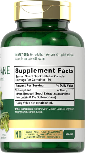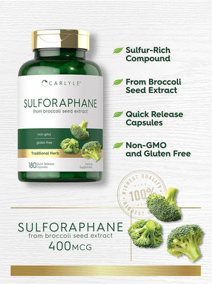 Descubre los beneficios del Sulforafano de Carlyle, un suplemento herbal tradicional derivado del extracto de semilla de brócoli. Con 180 cápsulas en cada envase, este suplemento está formulado para ofrecer una potente dosis de sulforafano, un compuesto conocido por sus propiedades antioxidantes y desintoxicantes.