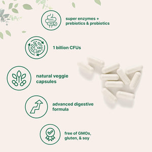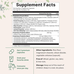 Cada botella contiene 240 cápsulas vegetarianas naturales. Una fórmula todo en uno que incluye una mezcla diversa de amilasa, papaína, bromelina, cáscara de psyllium, inulina, lactobacillus, bifidobacterium y más.