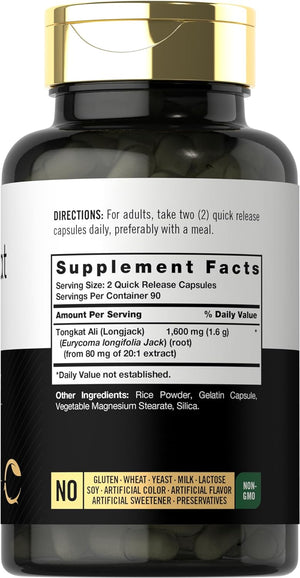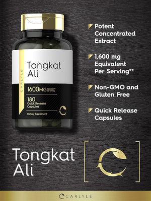 Tongkat Ali de Carlyle es una forma poderosa de esta hierba exótica, que contiene el equivalente a 1600 mg de raíz de Longjack por porción en cápsulas de liberación rápida. Nuestra fórmula no contiene gluten ni OGM, está elaborada sin saborizantes, colorantes, edulcorantes ni conservantes artificiales, lo que la convierte en el complemento perfecto para cualquier rutina.