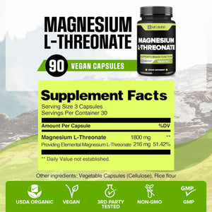El magnesio se puede incluir fácilmente en su dieta como un suplemento dietético para la ingesta diaria. Tomar 3 cápsulas de magnesio L-treonato con agua es equivalente a un suministro diario de 1800 mg para el cuerpo. Cada compra tendrá 90 cápsulas por botella durante los 30 días.