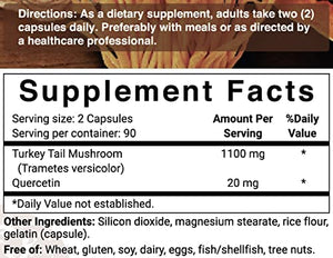Suplemento de cola de pavo, 1100 mg de extracto de cola de pavo más 20 mg de quercetina por porción, 180 cápsulas, fórmula 2 en 1, suplemento diario de micelio de hongos.