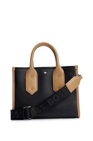 Bolso tote mate de BOSS en material granulado con efecto bicolor, con correa con el logo y pin con rayas distintivas. Medidas: 21 x 26,5 x 13 cm