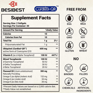 Fórmula avanzada con omega-3S: cada Ubiquinol coq10 600mg softgel de Besibest contiene 300 mg de omega-3s. Una combinación de CoQ10 Ubiquinol y omega 3, 6, 9 puede ser un potente antioxidante para el cuerpo y ayudar a tu cuerpo a absorber y utilizar mejor CoQ-10.