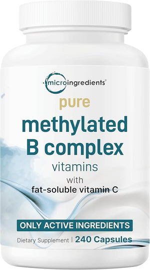 Micro Ingredients ofrece vitaminas del complejo B metilado puro. Soporte 11 en 1 con vitamina C soluble en grasa. Una fórmula en cápsulas que contiene ingredientes activos crudos sin rellenos.