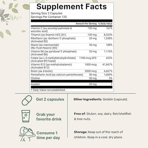 Cada botella contiene 240 cápsulas. Ofrece vitamina C (palmitato de ascorbilo + ácido ascórbico), tiamina, riboflavina (R5P), niacina (niacinamida), B6 (P5P), folato, B12 (metilcobalamina), biotina, ácido pantoténico, colina e inositol por porción.