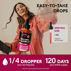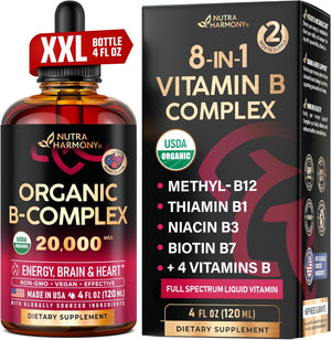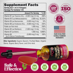 Complejo de Vitamina B con certificación USDA Organic: potencia tu energía y vitalidad con nuestras gotas líquidas de complejo B con calidad USDA Organic, que contienen vitamina B5 y metilcobalamina B12. El complejo de vitamina B orgánico B1, B2, B3, B4, B5, B6, B7, B9 y B12 está diseñado para aumentar los niveles de energía. Este concentrado líquido es una fuente ideal para sentirse más vivo y vibrante cada día.