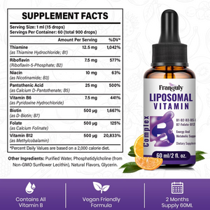 Contiene todas las vitaminas B: la fórmula líquida liposomal del complejo B de rápida absorción contiene toda la vitamina B que nuestros cuerpos necesitan, incluyendo B1, B2, B3, B5, B6, biotina B7, ácido fólico B9, metilado B12. Todas las vitaminas B deben actuar al mismo tiempo, conocidas como la fusión de VB. Si tomas un tipo de VB solo, otra demanda de VB seguirá el aumento. Por lo tanto, los efectos de los diversos VB son complementarios entre sí, el llamado "principio del barril".