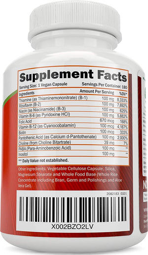 TODAS LAS 8 VITAMINAS B - Nuestro complejo vit B incluye todas sus 8 vitaminas B en una sola porción. Hemos combinado las vitaminas B1 (Tiamina), B2 (Riboflavina), B3 (Niacina), B5 (Ácido pantoténico), B6 (Clorhidrato de piridoxina), B7 (Biotina), B9 (Ácido fólico) y B12 (Cianocobalamina) en una conveniente una cápsula de día. Las vitaminas B son especialmente importantes para mantener una buena salud. Si prefiere tomar sus vitaminas B (como B-12 y 6) juntas para maximizar los beneficios, ¡nuestra formulación es la indicada para usted!