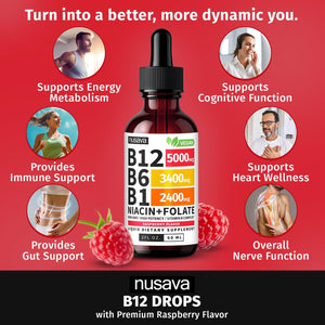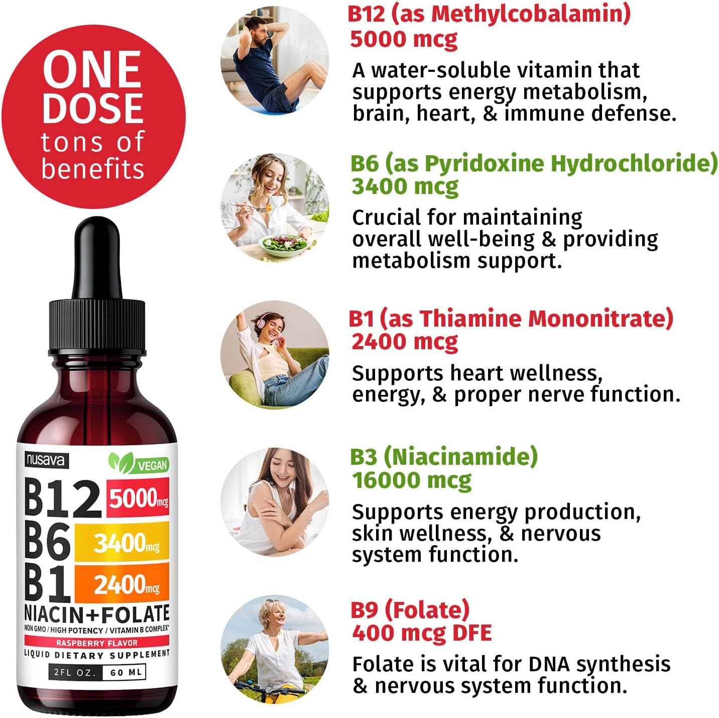 - Gotas B12 formuladas para una máxima potencia: nuestras gotas líquidas de vitamina B12 contienen vitamina B12 de 5000 mcg, B6, B1, niacina y ácido fólico, apoyando las funciones generales del cuerpo con un valor diario del 100% o más.