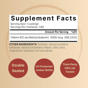 Potencia óptima de dosis de 5.000 mcg. Una porción al día. Suministro total de 6 meses. Forma activa de metilo B12 de alta calidad.
