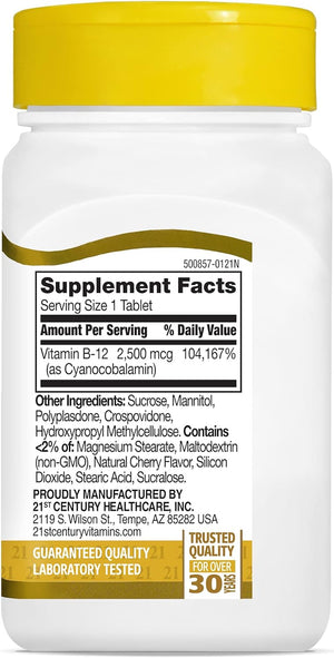 VITAMINA B12 SUBLINGUAL SABOR CEREZA 2,500 MCG 110 TABLETAS 21ST CENTURY