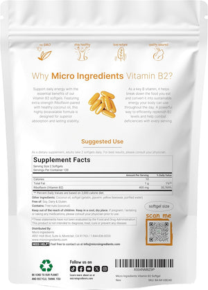 Micro Ingredients ofrece tabletas de vitamina B2 fáciles de tragar, forma de riboflavina biodisponible, beneficios esenciales de micronutrientes de vitamina B, fuerza adicional de 400 mg por porción de dos tabletas.