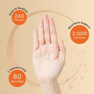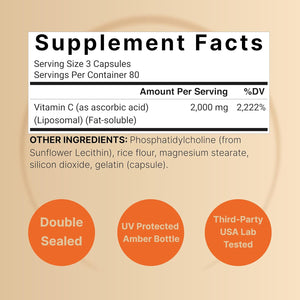 Cápsulas de vitamina C liposomal biodisponibles de alta biodisponibilidad, 240 cápsulas por botella con 80 porciones que contienen una dosis máxima de 2.000 mg de ácido ascórbico soluble en grasa puro.