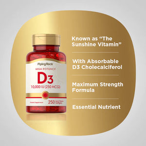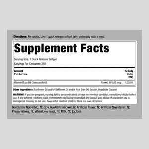 VITAMINA D3 10,000 IU 250 CAPSULAS BLANDAS SIN GMO PIPING ROCK