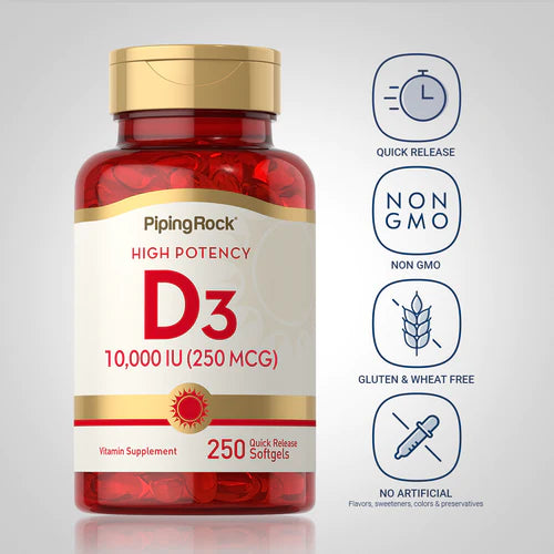 La vitamina D se asocia comúnmente con ser la & # x02017 vitamina & # x02013 sol & # x02014 & Es un nutriente vital del que, desafortunadamente, no obtenemos suficiente cuando llega el clima más frío, y la luz solar es más escasa. Para garantizar que sus niveles sean siempre óptimos, la vitamina D3 de alta potencia de Piping Rock proporciona una manera conveniente de ingerir esta sustancia diariamente. Suministrándote 10000 UI por cápsula blanda de liberación rápida, puedes estar seguro, sol o no, estás cubierto.
