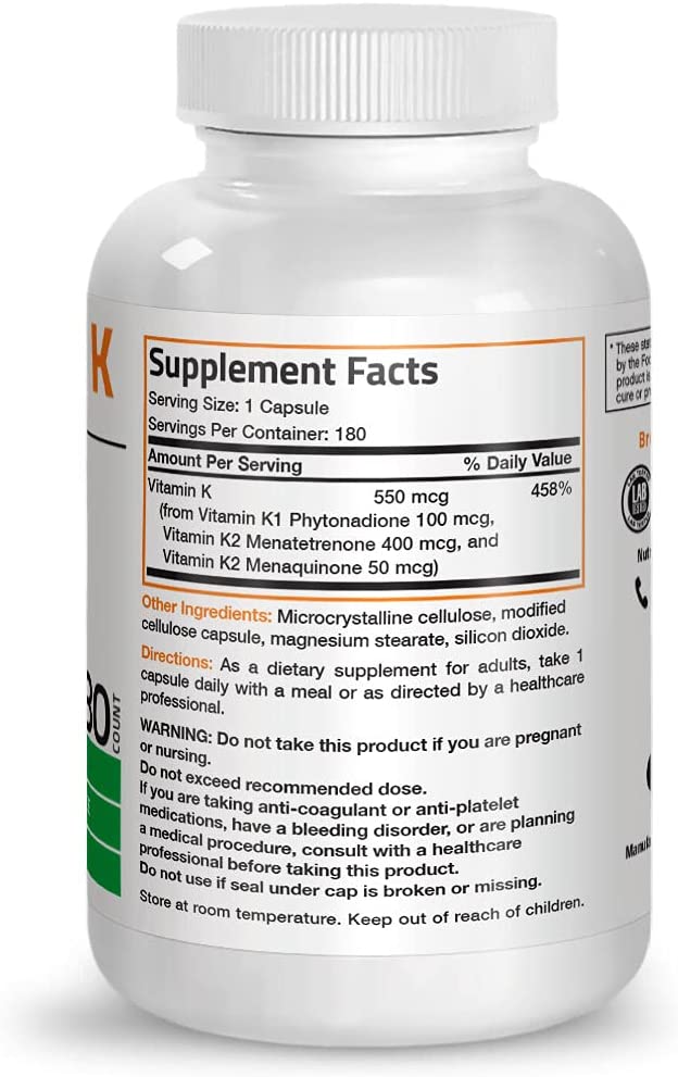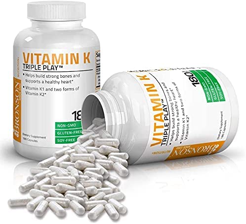 BRONSON Suplemento de vitamina K complejo de espectro completo: proporciona vitamina K1 y dos formas de vitamina K2, vitamina K2 MK4 (menatetrenona-4) y vitamina K2 MK7 (menaquinona-7). ALTA DOSIS 550MCG!!!!