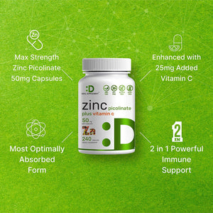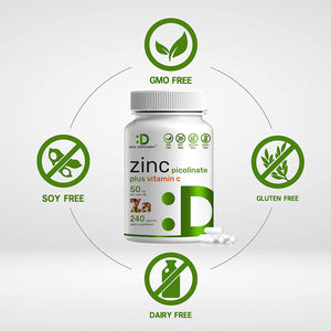 Zinc Picolinate Supplements con Vitamin C, 50mg Elemental Zinc Por Capsula, 240ct